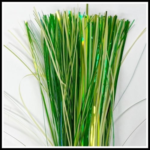 Tree Frog LL3 020 is one of our popular custom tinsel blends for muskie, walleye, and northern pike fishing. It comes in a variety of sizes; 8 inch skirt tied on coil, 9 inch skirt on skirt body, 32 inch hank, or 64 inch hank. It is a blend of 1/32 inch Green Crackle, Butter Cream and Luster Spring Green.