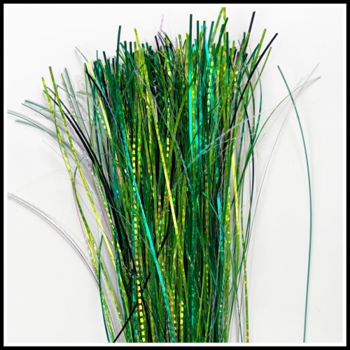 Lake of the Woods Fishscale LL3 040 is one of our popular custom tinsel blends for muskie, walleye, and northern pike fishing. It comes in a variety of sizes; 8 inch skirt tied on coil, 9 inch skirt on skirt body, 32 inch hank, or 64 inch hank. It is a blend of 1/32 inch Lake of the Woods with Fishscale Dark Green.