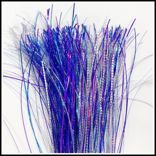 Purple Rain Fishscale LL3 042 is one of our popular custom tinsel blends for muskie, walleye, and northern pike fishing. It comes in a variety of sizes; 8 inch skirt tied on coil, 9 inch skirt on skirt body, 32 inch hank, or 64 inch hank. It is a blend of 1/32 inch Purple Rain with Fishscale Silver