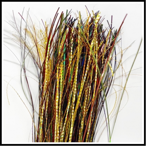 Camo Fishscale LL3 043 is one of our popular custom tinsel blends for muskie, walleye, and northern pike fishing. It comes in a variety of sizes; 8 inch skirt tied on coil, 9 inch skirt on skirt body, 32 inch hank, or 64 inch hank. It is a blend of 1/32 inch Camo with Fishscale Gold.